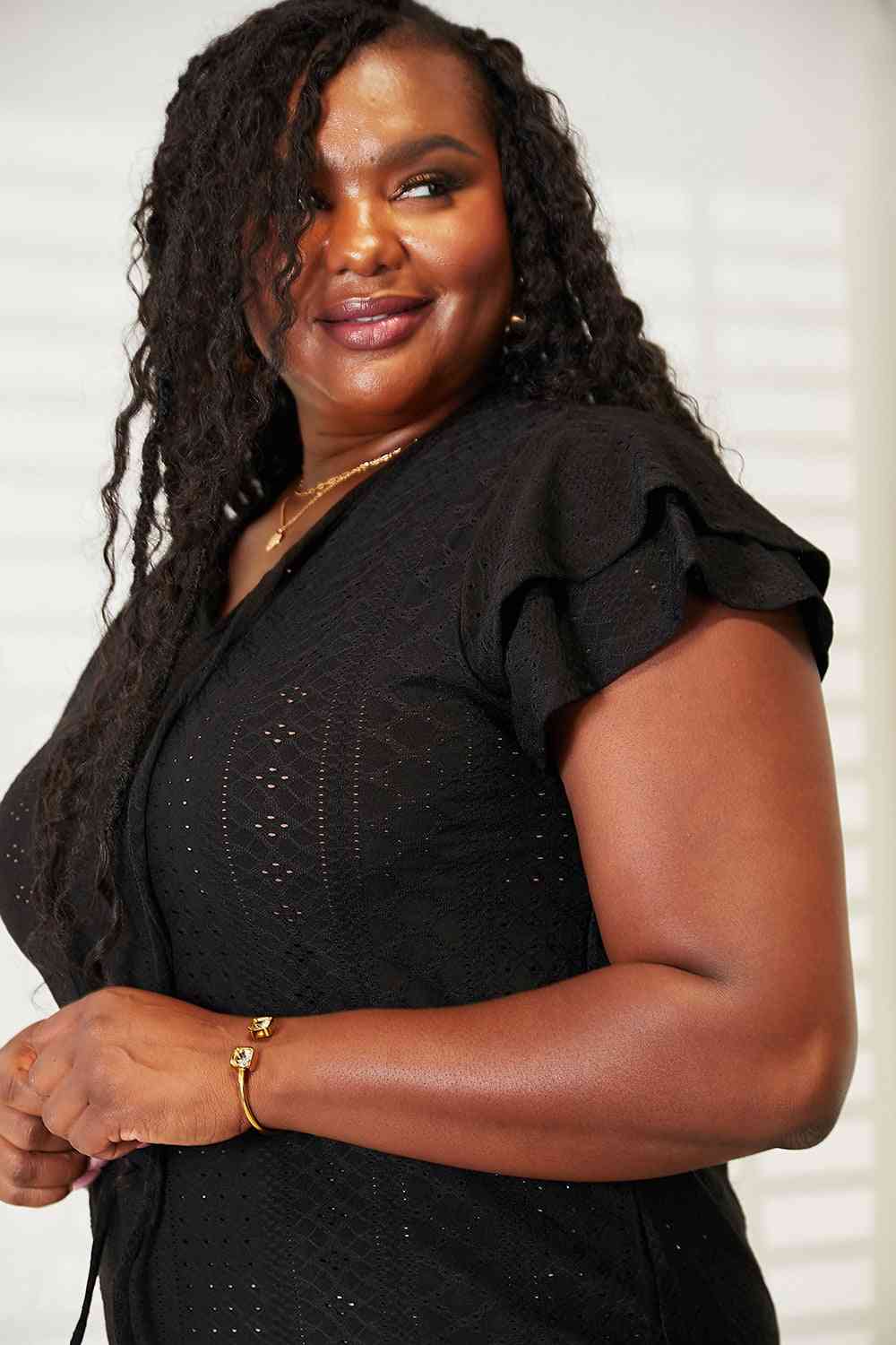 Elevate your style with this stunning Eyelet Tie-Neck Flutter Sleeve Top. The intricate eyelet design and flutter sleeves give a feminine and whimsical touch, while the tie-neck adds a touch of elegance and sophistication.